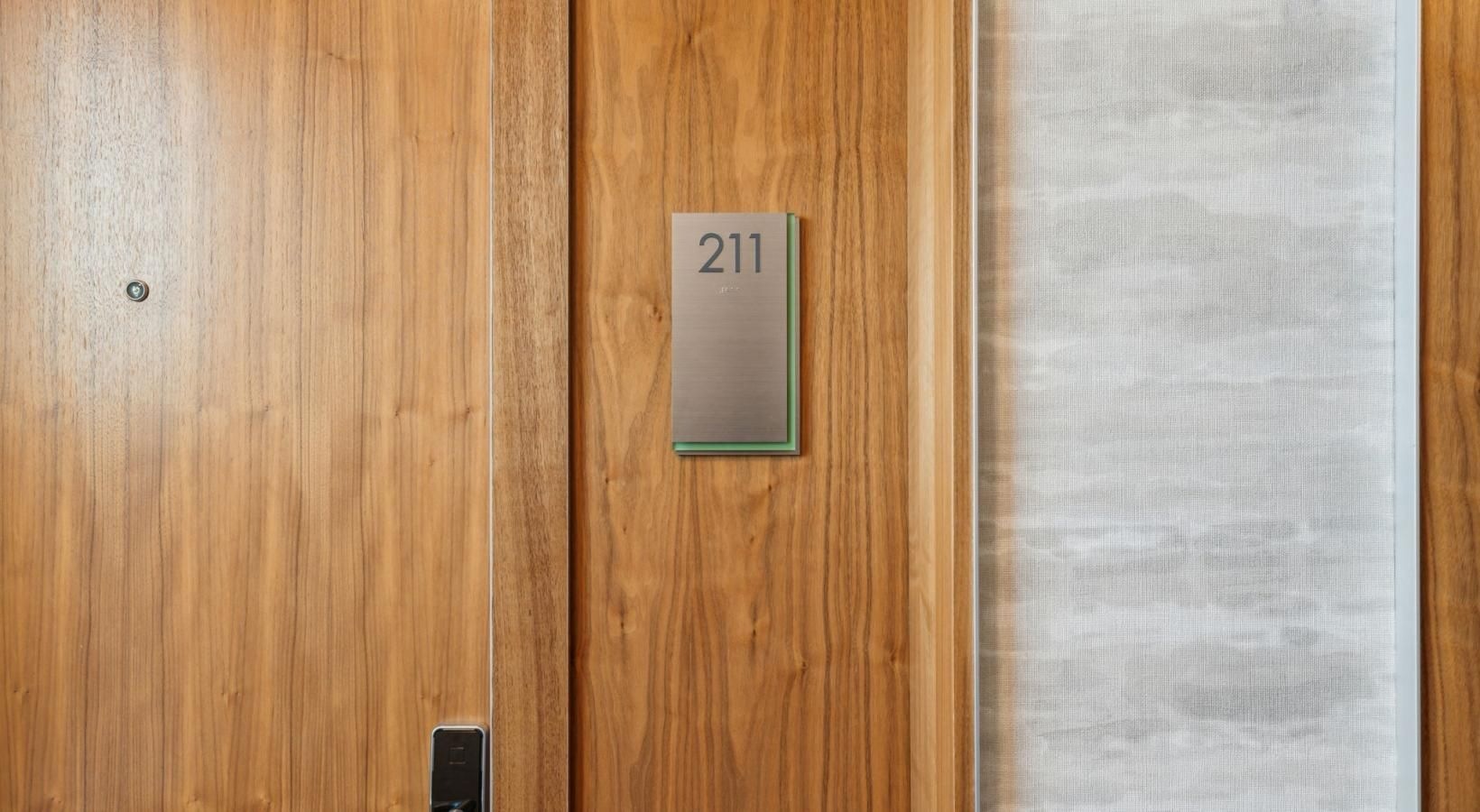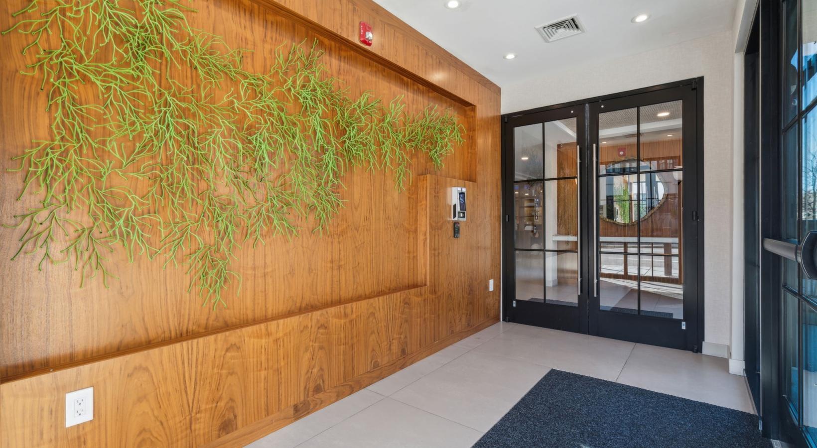 • a room with a wood wall and glass doors
