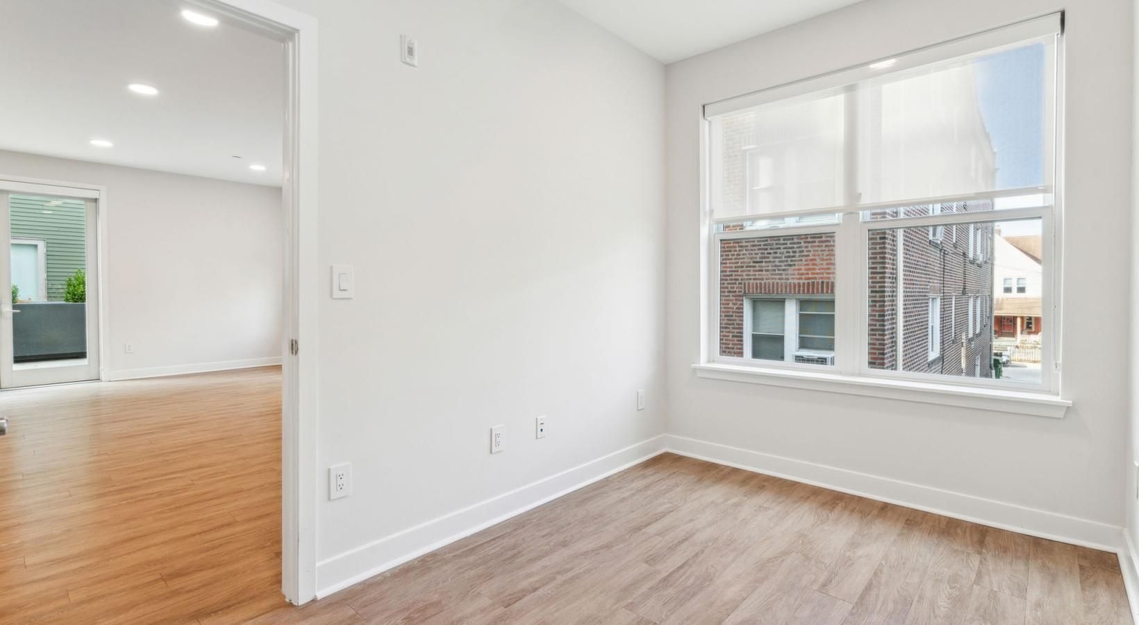 • a room with a wood floor and a window with blinds