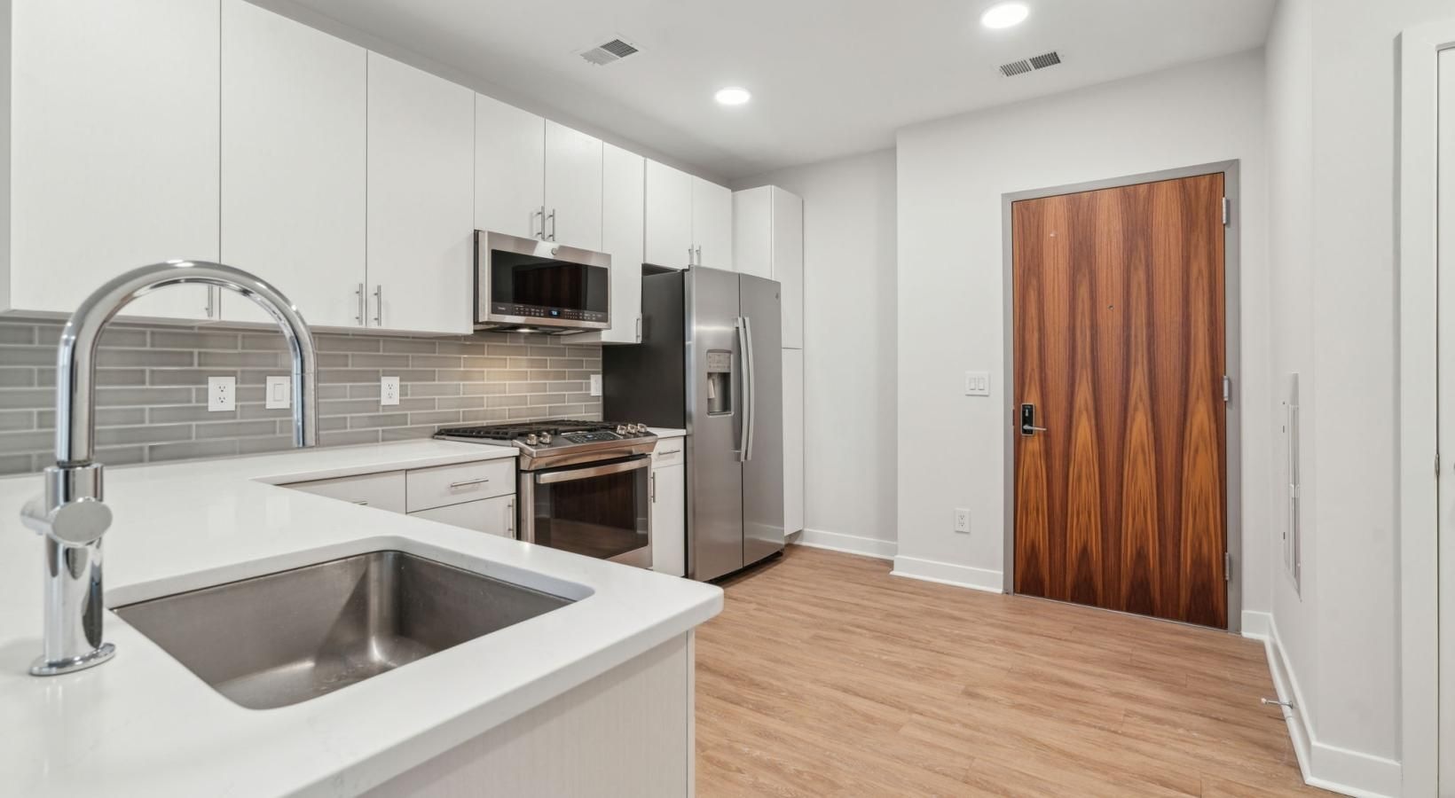 • a kitchen with white cabinets