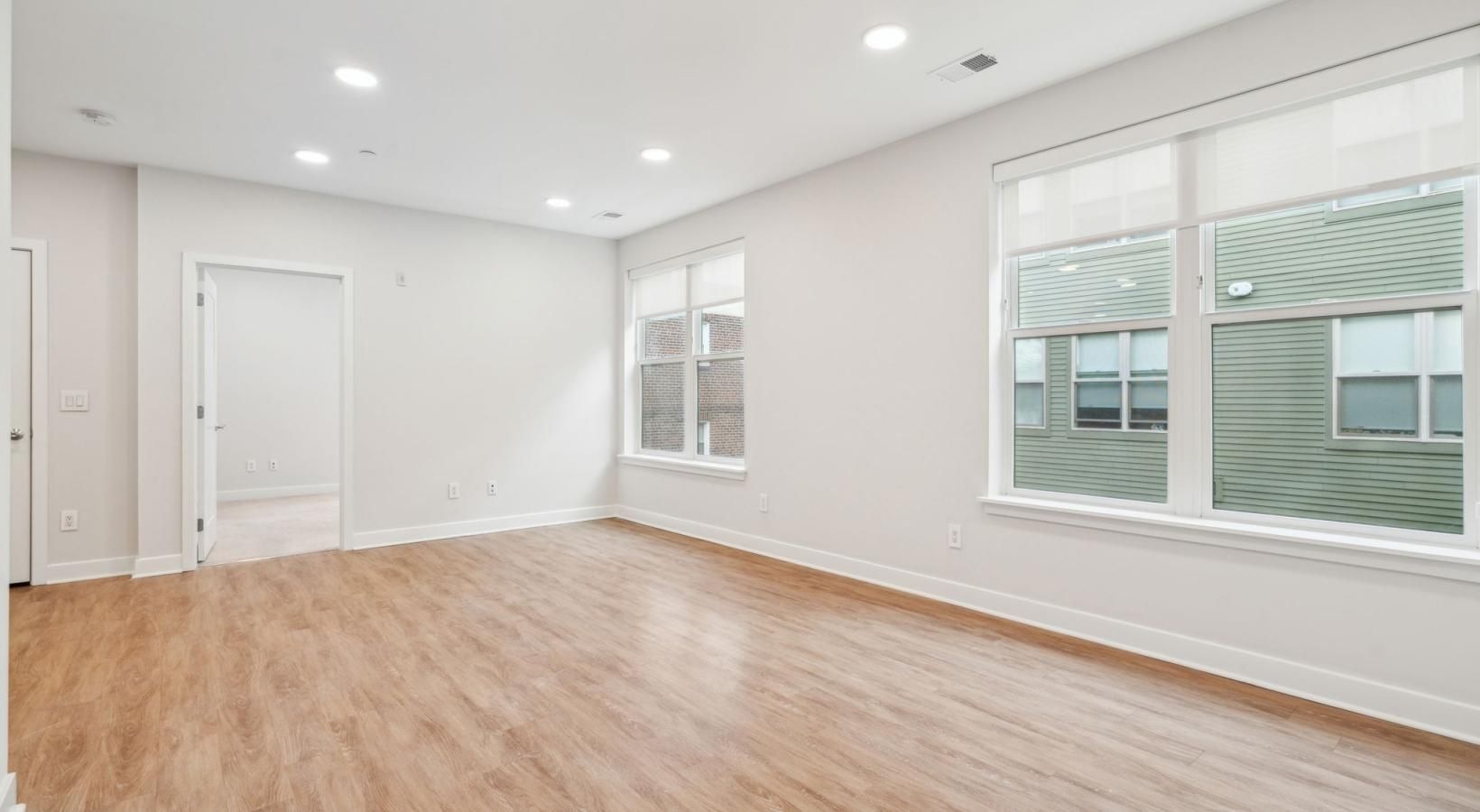 • a room with a wood floor and windows