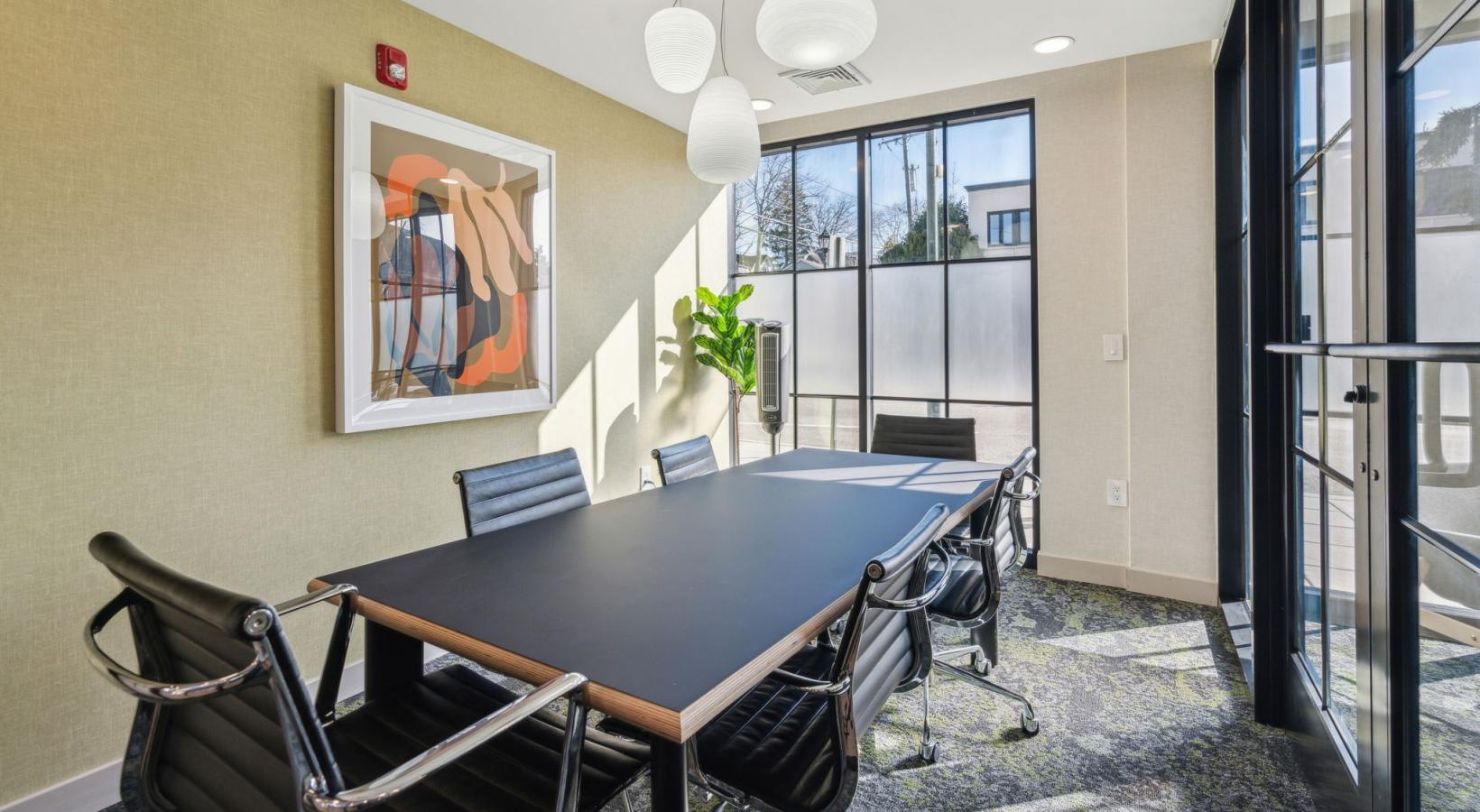 • a room with chairs and a large glass wall